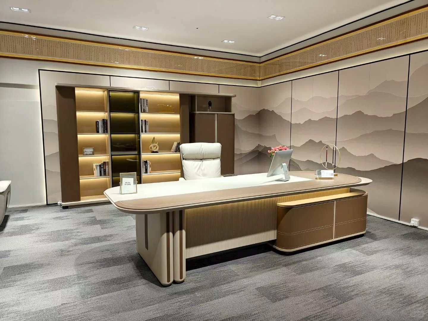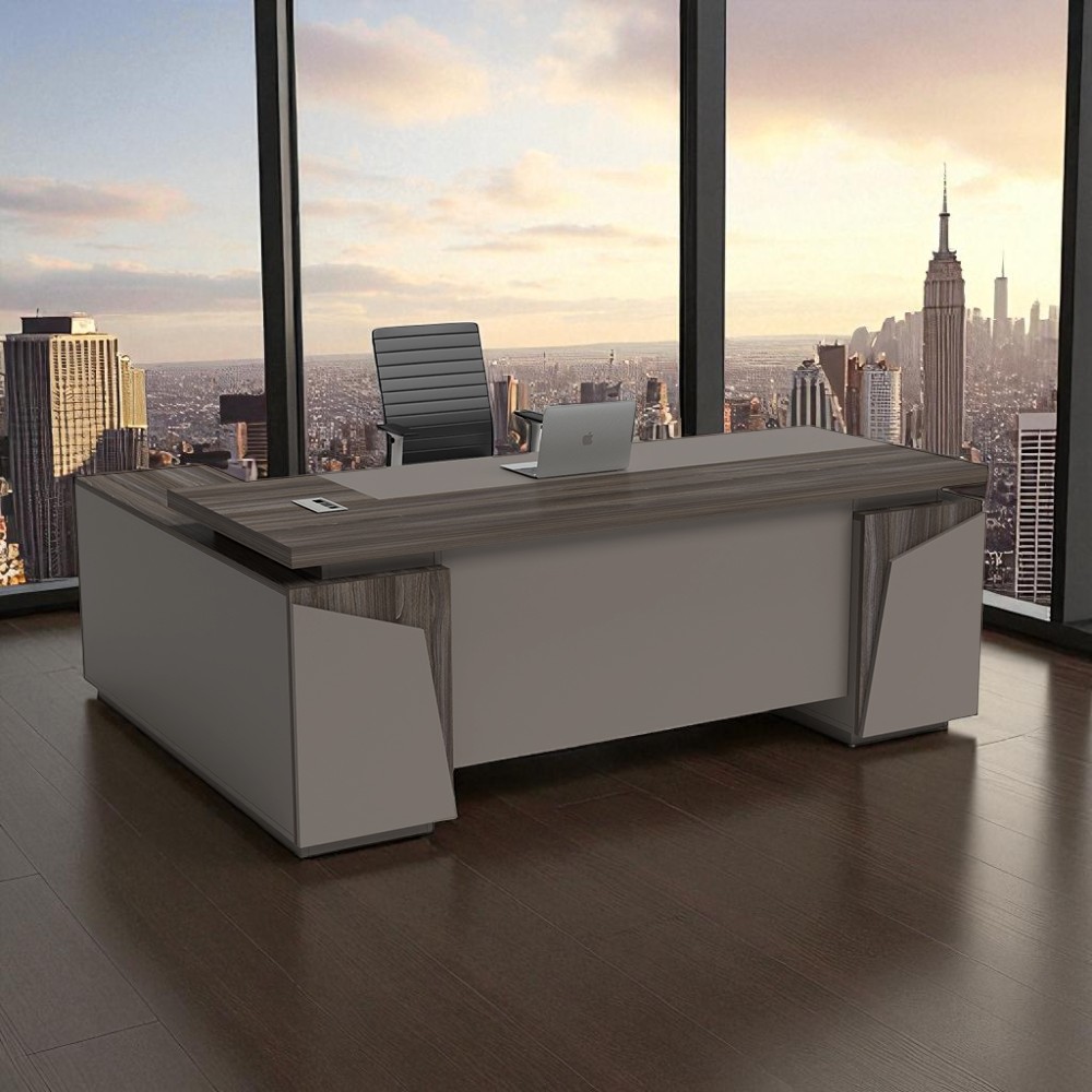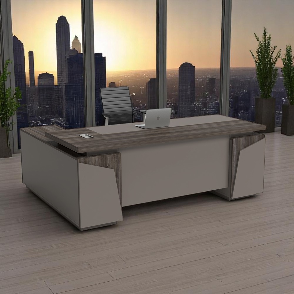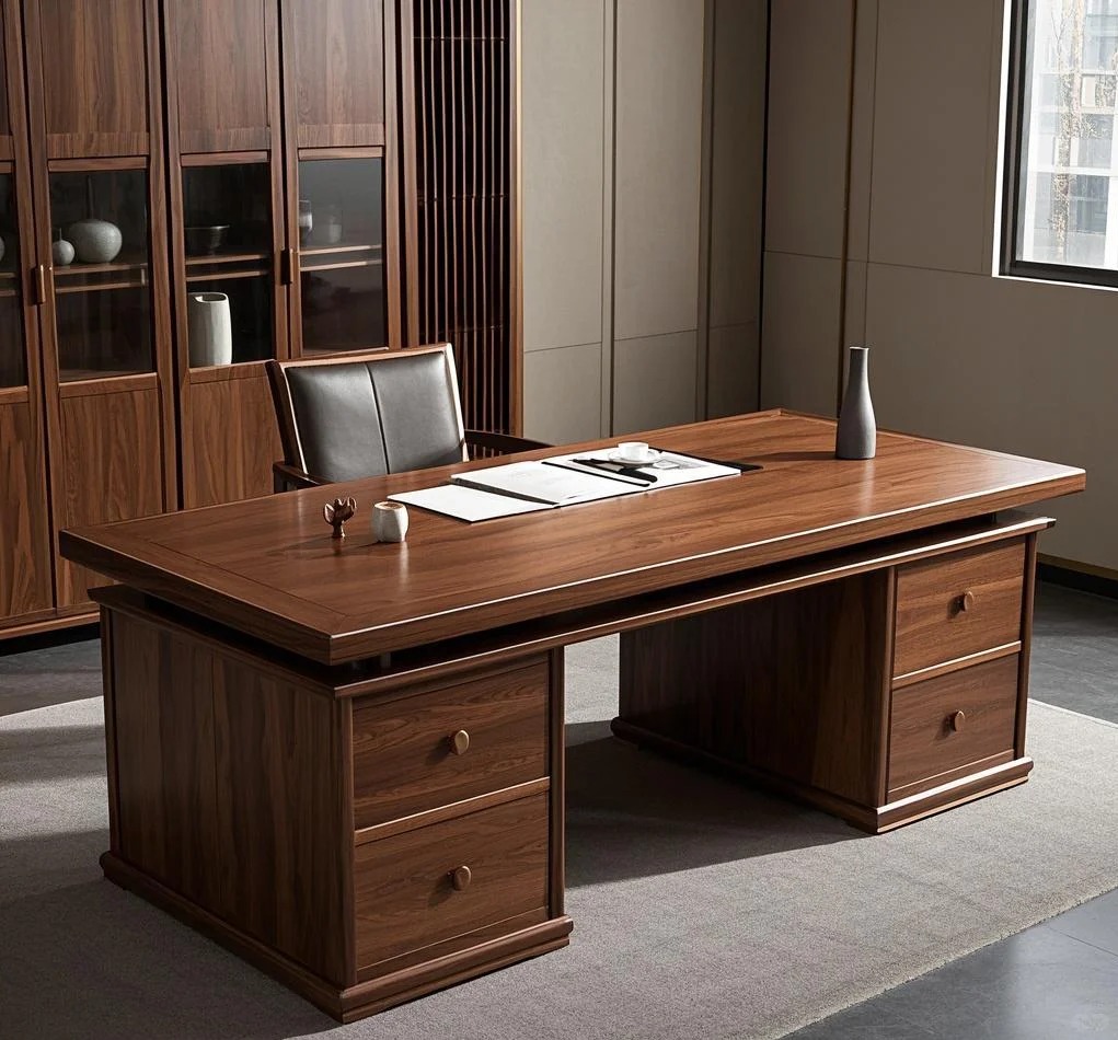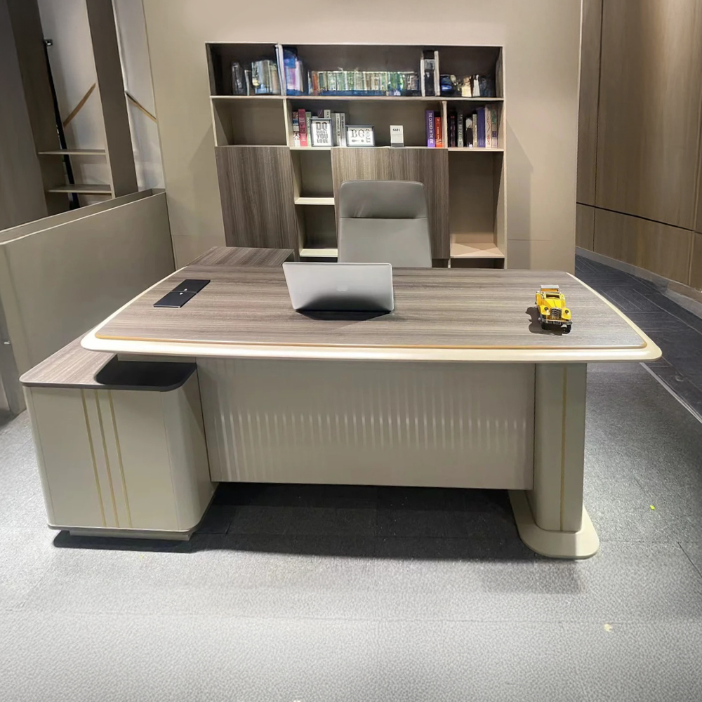 Kiểu bàn này thường được kết hợp với ghế giám đốc gỗ bọc da hoặc ghế lớn tông màu trầm, góp phần tạo nên không gian làm việc sang trọng và đầy bản lĩnh.