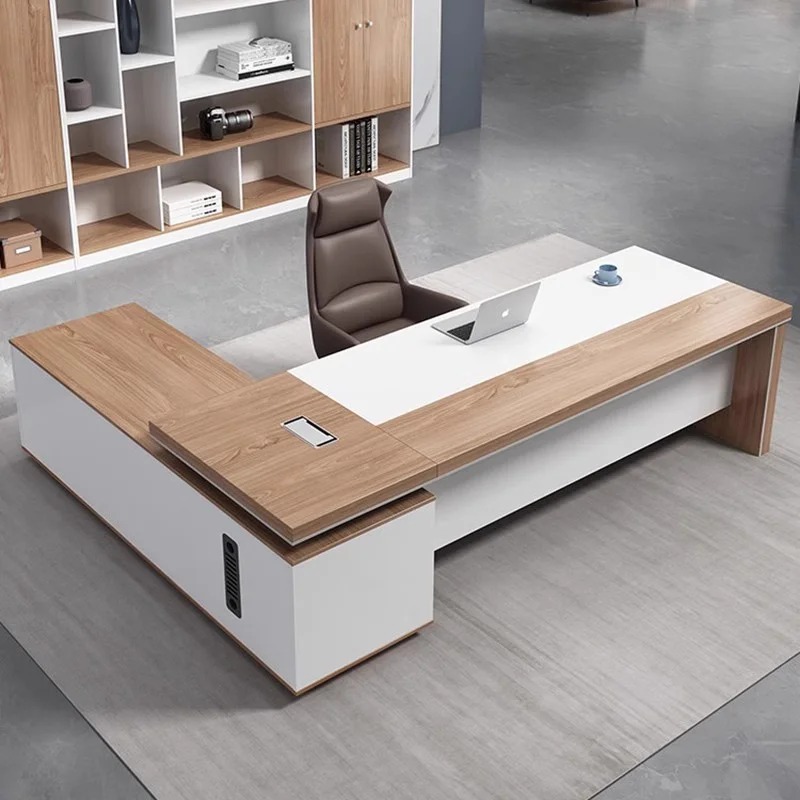 Bàn giám đốc gỗ công nghiệp được làm từ chất liệu MDF hoặc MFC lõi xanh chống ẩm, bề mặt phủ Laminate, melamine hoặc Veneer mang lại vẻ đẹp sang trọng không thua kém gỗ tự nhiên. Với thiết kế đa dạng, từ đơn giản đến cầu kỳ, mẫu bàn này đáp ứng nhu cầu của nhiều phong cách văn phòng hiện đại. Khi kết hợp với ghế giám đốc bọc da hoặc lưới cao cấp, bộ bàn ghế giám đốc này không chỉ mang tính thẩm mỹ mà còn hỗ trợ làm việc hiệu quả.