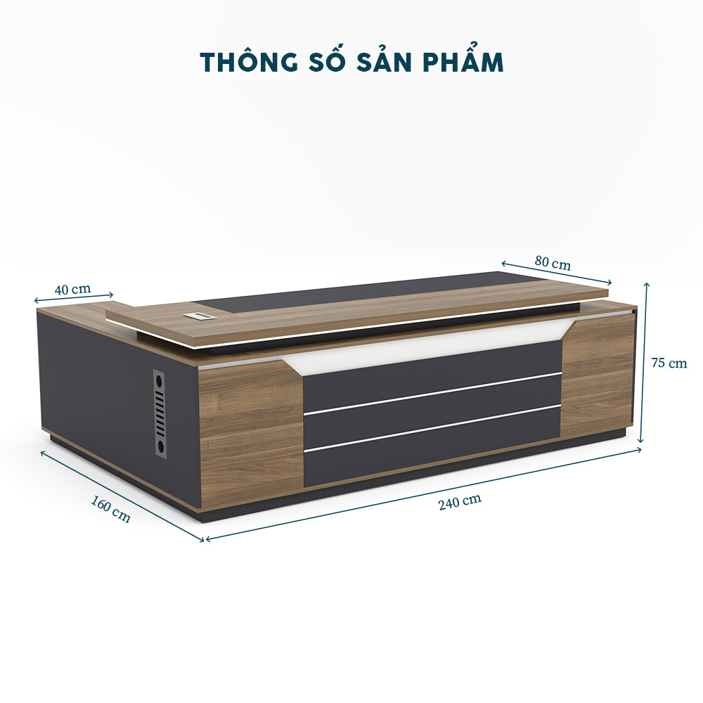 Sản phẩm có kích thước tổng thể (Dài: 240 cm x Rộng: 160 cm x Cao: 75 cm), đi kèm hộc tủ bên trái (40 cm x 160 cm) với một ngăn kéo và kệ mở, mặt bàn gỗ màu óc chó đậm, khung chân và hộc tủ sơn màu xám graphite, tạo nên vẻ ngoài mạnh mẽ và tinh tế.