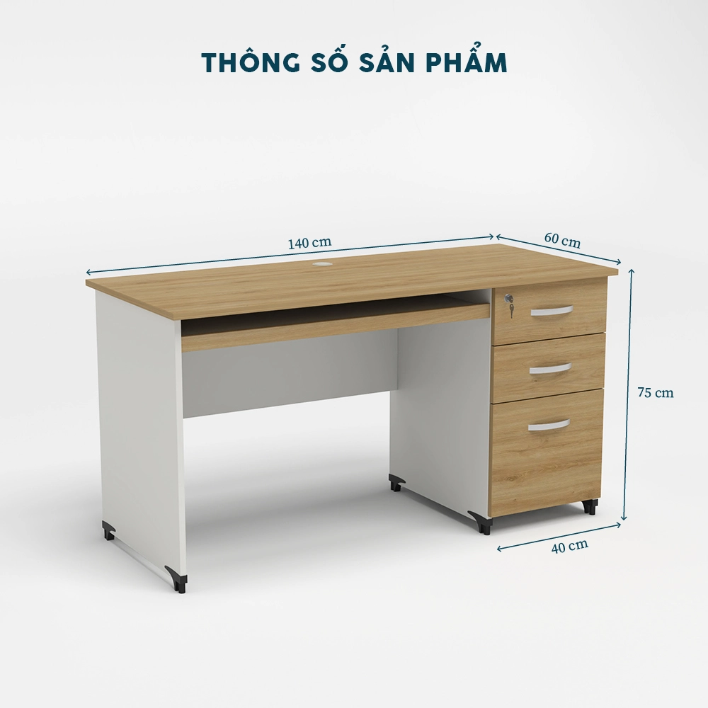 Mặt bàn rộng rãi: Diện tích (140 cm x 60 cm) đủ chỗ cho máy tính, tài liệu, tích hợp lỗ luồn dây gọn gàng.