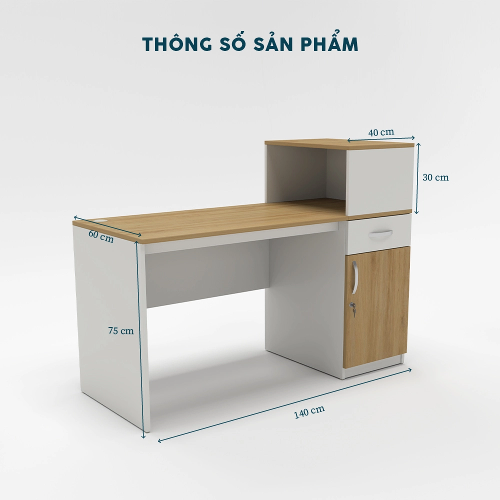 Mặt bàn rộng rãi: Diện tích (140 cm x 60 cm) đủ chỗ cho máy tính, tài liệu, tích hợp lỗ luồn dây gọn gàng.