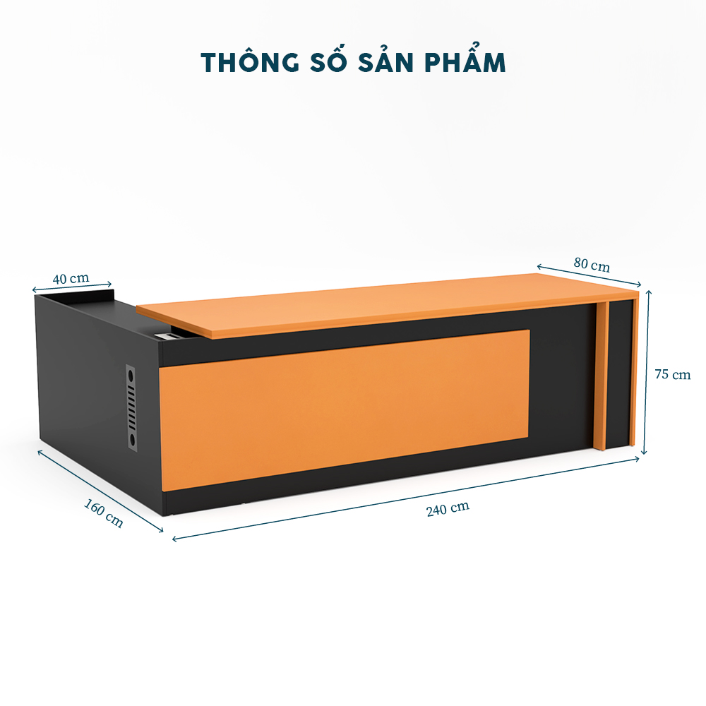 - Kích thước rộng lớn: Kích thước (Dài: 240 cm x Rộng: 160 cm x Cao: 75 cm) cung cấp không gian làm việc thoải mái, hỗ trợ cả công việc và các buổi họp nhỏ.