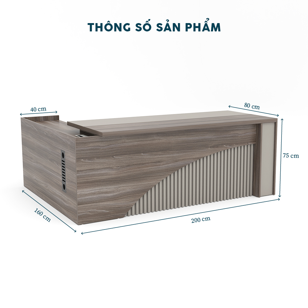 Sản phẩm có kích thước tổng thể (Dài: 200 cm x Rộng: 160 cm x Cao: 75 cm), đi kèm hộc tủ bên trái (40 cm x 160 cm) với một ngăn kéo và kệ mở, mặt bàn gỗ màu xám vân gỗ, khung chân và hộc tủ sơn màu trắng ngọc, tạo nên vẻ ngoài thanh thoát và hiện đại.