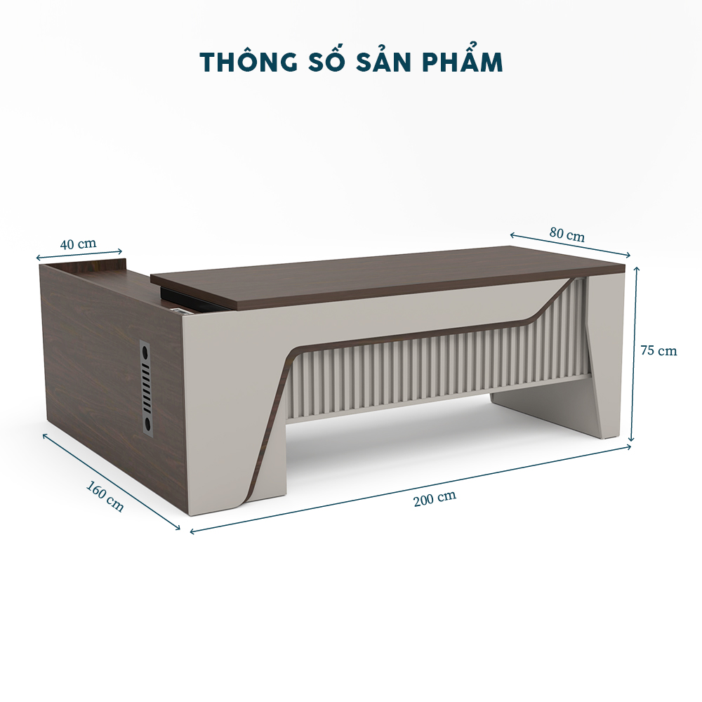 Sản phẩm có kích thước tổng thể (Dài: 200 cm x Rộng: 160 cm x Cao: 75 cm), đi kèm tủ phụ bên trái (40 cm x 160 cm) với một ngăn kéo và kệ mở, mặt bàn gỗ màu nâu đậm, khung chân và viền sơn màu xám nhạt, tạo nên vẻ ngoài mạnh mẽ và tinh tế.