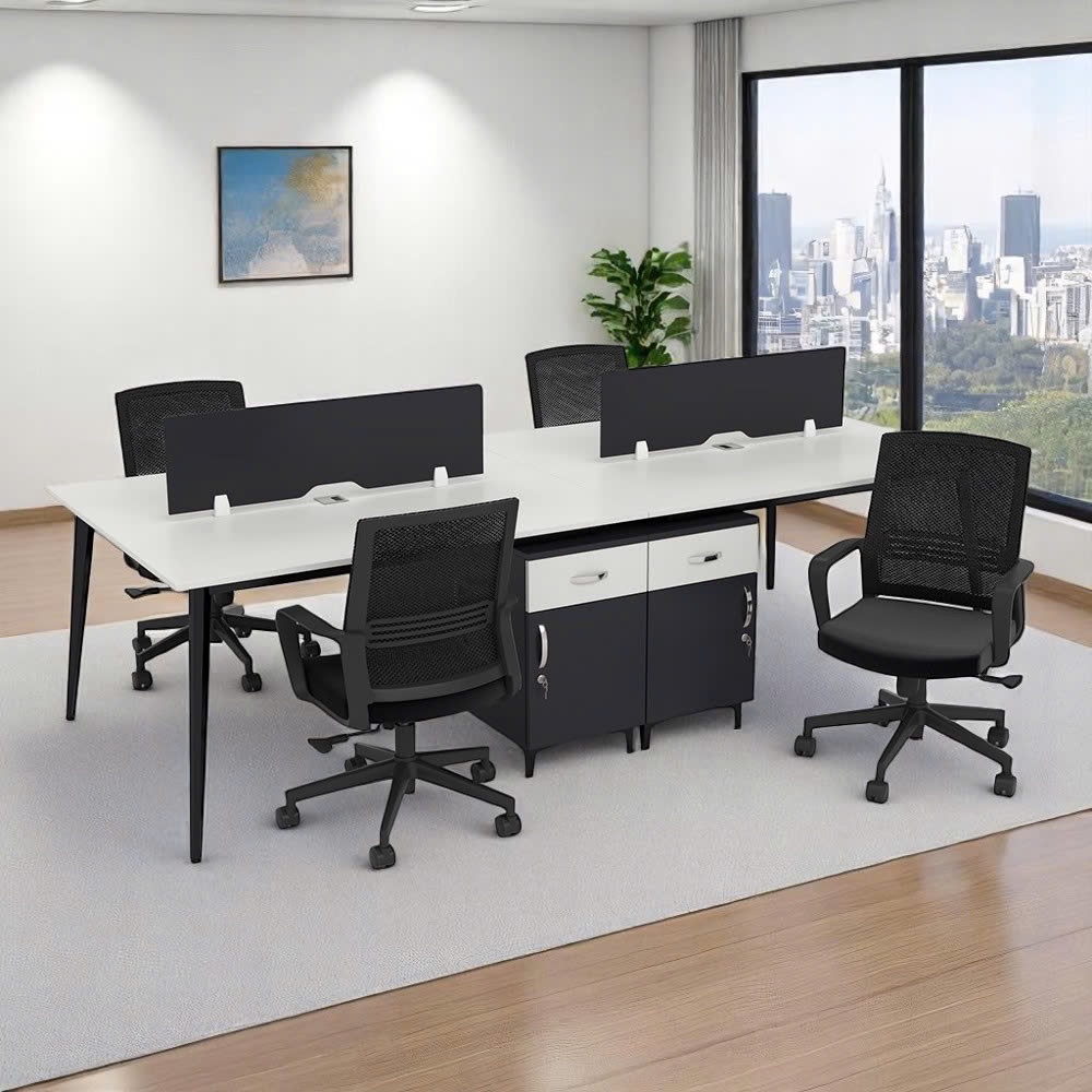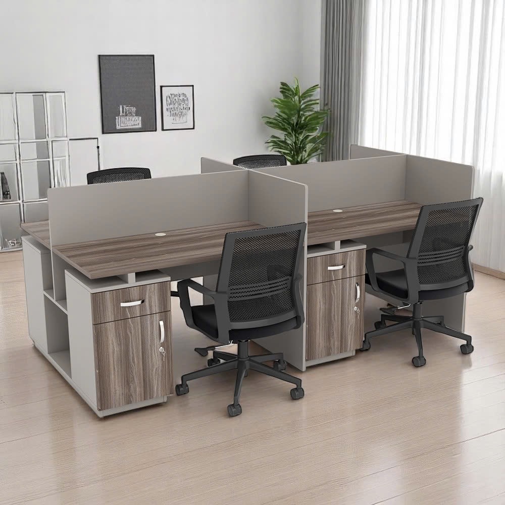 Bàn cụm 4 người được thiết kế theo dạng module, phù hợp cho các nhóm làm việc cần tương tác thường xuyên. Thiết kế này giúp tiết kiệm diện tích và tạo sự đồng bộ.