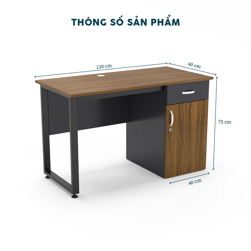 Tính năng tiện ích. Mặt bàn rộng rãi (120 x 60 cm) đủ chỗ cho máy tính, tài liệu, vật dụng cá nhân. Tủ phụ (40 x 60 cm) với ngăn kéo và ngăn khóa đảm bảo lưu trữ an toàn, tiện lợi. Không gian mở dưới bàn (cao 60 cm, rộng 80 cm) cho phép đặt CPU, máy in nhỏ, tăng tính linh hoạt.