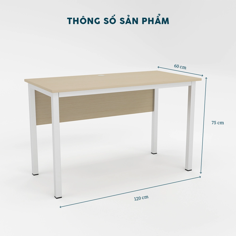 - Mặt bàn rộng rãi: Diện tích (120/140 cm x 60 cm) đủ để đặt máy tính, tài liệu và vật dụng cá nhân, tích hợp lỗ luồn dây để không gian luôn ngăn nắp.