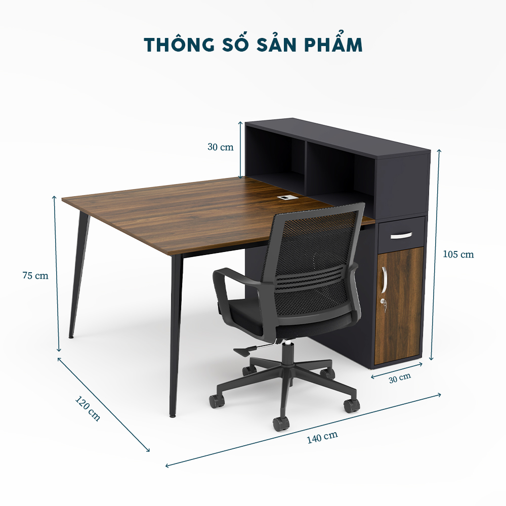 - Kích thước rộng rãi: Kích thước (Dài: 140 cm x Rộng: 120 cm x Cao: 75 cm) cung cấp không gian làm việc thoải mái cho hai người, tối ưu hóa diện tích.