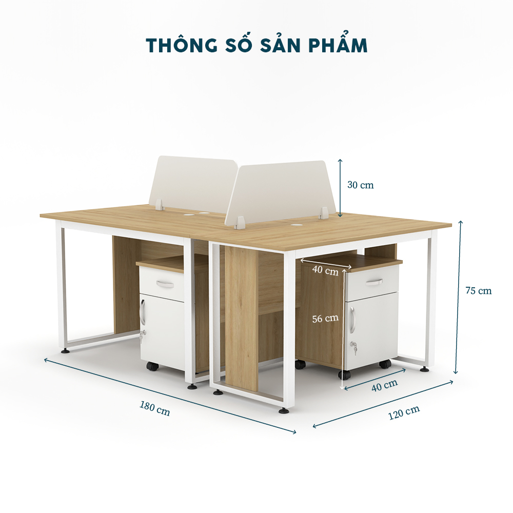 - Kích thước rộng rãi: Kích thước (Dài: 180 cm x Rộng: 120 cm x Cao: 75 cm) cung cấp không gian làm việc thoải mái cho hai người, tối ưu hóa diện tích.