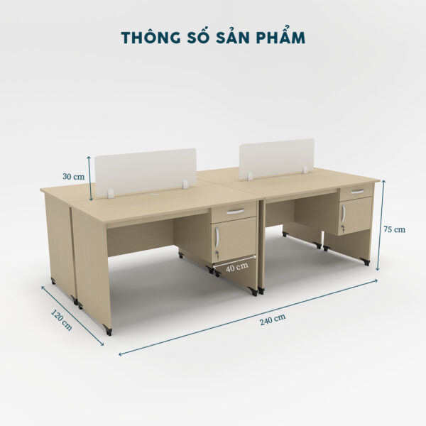Thiết kế dành cho 4 người giúp tối ưu diện tích văn phòng mà vẫn đảm bảo không gian làm việc rộng rãi, thoải mái. Đây là lựa chọn lý tưởng cho các văn phòng cần không gian làm việc nhóm, tiết kiệm diện tích mà không làm giảm hiệu quả công việc.