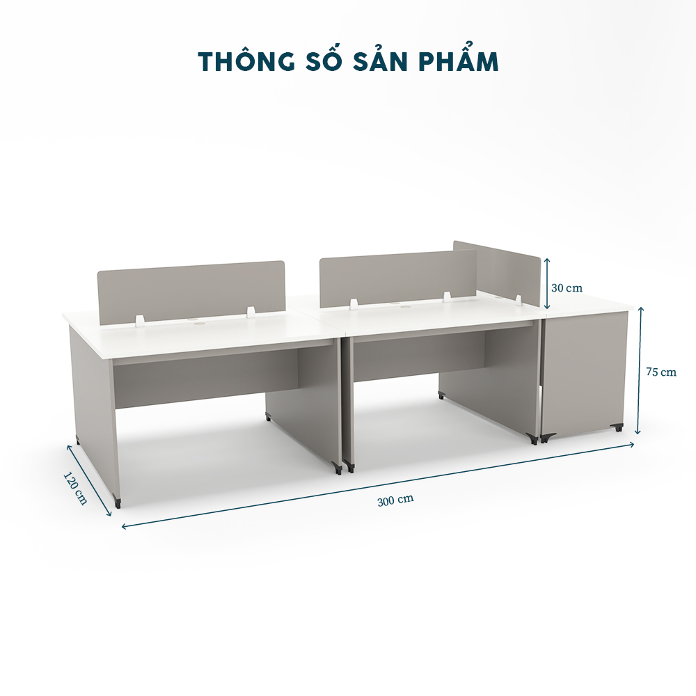 Với kích thước 300cm x 120cm, Cụm Bàn Làm Việc 5 Người CBNV04-3012 cung cấp không gian làm việc thoáng đãng cho 5 người. Thiết kế thông minh với vách ngăn cao 30 cm và ngăn lưu trữ tích hợp giúp tối ưu hóa diện tích, mang lại sự tiện lợi và chuyên nghiệp.