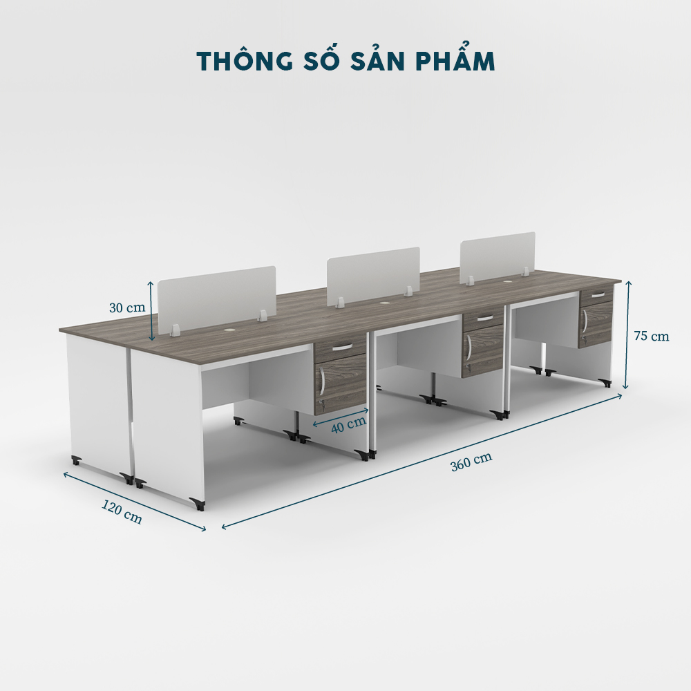 - Vách Ngăn Tinh Tế: Vách ngăn được tích hợp giữa các vị trí làm việc giúp phân chia không gian làm việc một cách khoa học, mang lại sự riêng tư cần thiết cho mỗi người, đồng thời giảm thiểu tiếng ồn và sự xao lãng trong công việc nhóm. Điều này tạo ra một môi trường làm việc tập trung và hiệu quả.