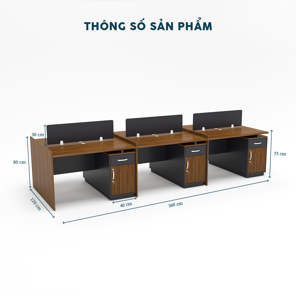 Với kích thước 360cm x 120cm, Cụm Bàn Làm Việc 6 Người CBNVY29-3612 cung cấp không gian làm việc thoáng đãng cho 6 người. Thiết kế thông minh với vách ngăn cao 30 cm và tủ lưu trữ (40 cm x 80 cm) giúp tối ưu hóa diện tích, mang lại sự tiện lợi và chuyên nghiệp.