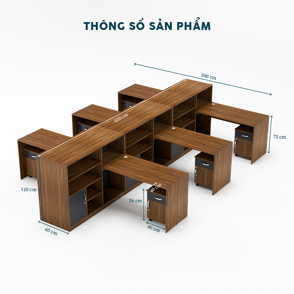 Với kích thước 300cm x 280cm, Cụm Bàn Làm Việc 6 Người CBNVY31-4230HT cung cấp không gian làm việc rộng rãi cho 6 người. Thiết kế thông minh với kệ lưu trữ (40 cm x 56 cm) và ngăn kéo tích hợp giúp tối ưu hóa diện tích, mang lại sự thoải mái và chuyên nghiệp.