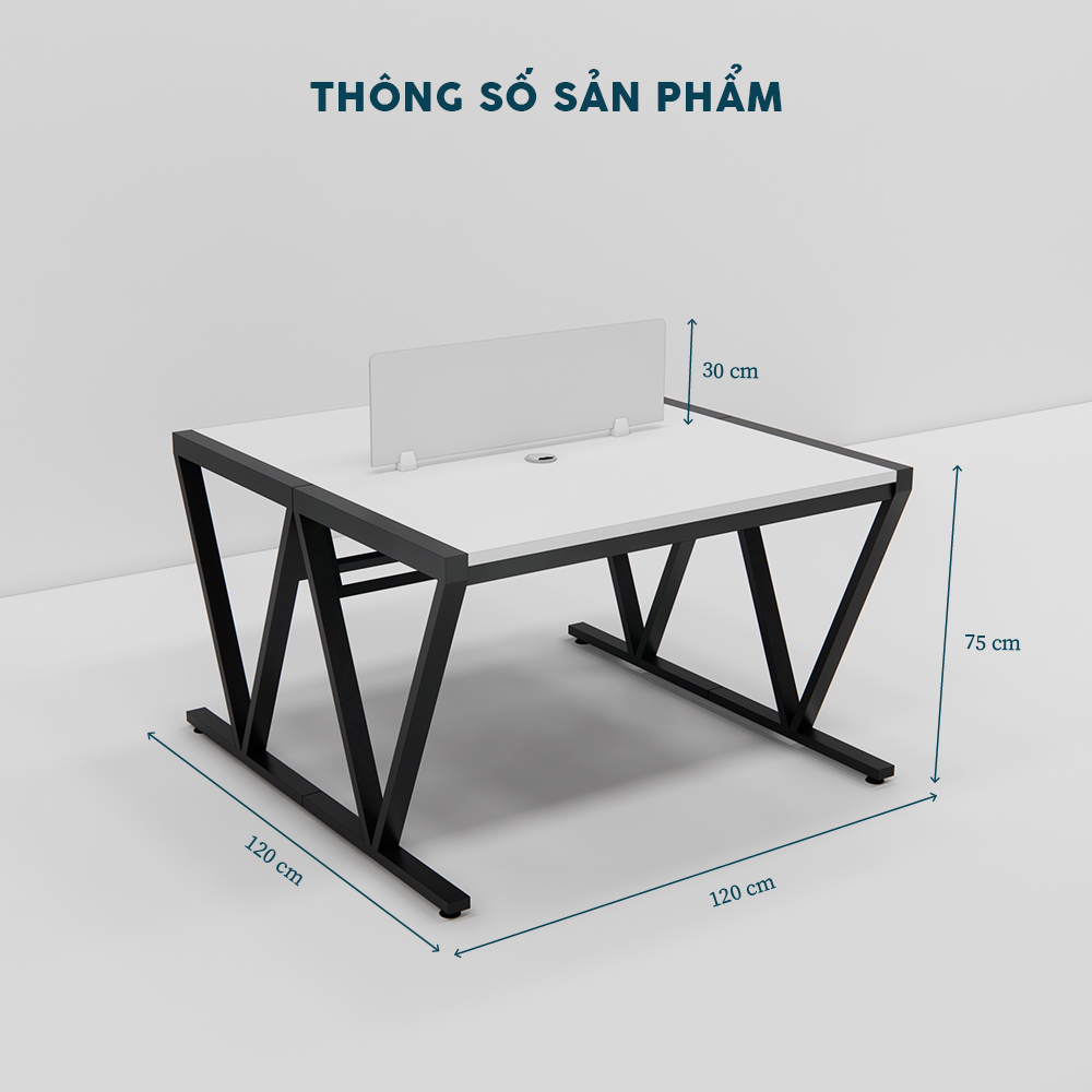 Mặt bàn được làm từ gỗ công nghiệp MDF E1 cao cấp, phủ Melamine chống trầy xước và chống thấm nước hiệu quả. Chất liệu này không chỉ đảm bảo độ bền lâu dài mà còn dễ dàng vệ sinh, giữ cho bề mặt bàn luôn mới mẻ, sáng bóng. Với kích thước tiêu chuẩn, bàn tạo không gian làm việc thoải mái cho hai nhân viên mà không chiếm quá nhiều diện tích.