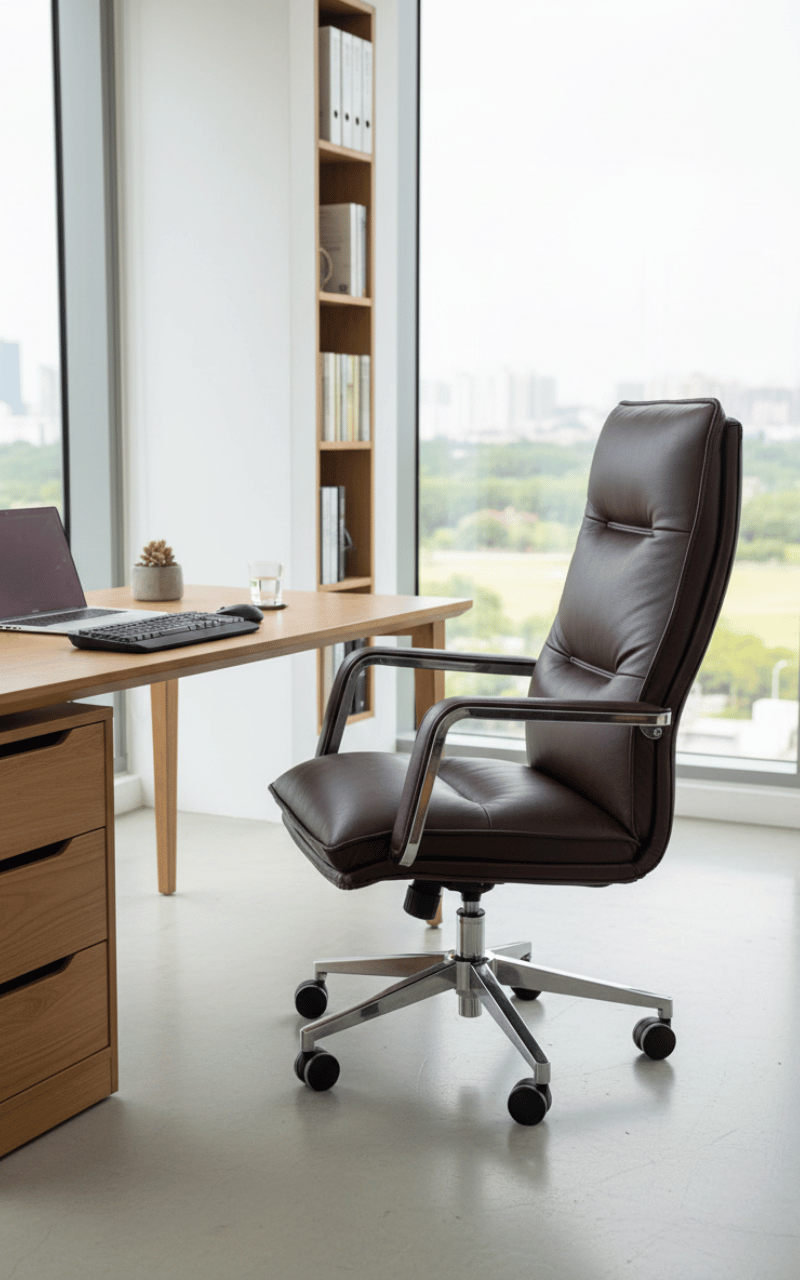 Tay vịn được chế tác từ kim loại mạ bóng, bo cong mềm mại và được bọc da đồng màu, vừa tăng tính thẩm mỹ vừa giúp tì tay dễ chịu. Thiết kế này góp phần tôn lên vẻ hiện đại, chuyên nghiệp của không gian lãnh đạo.