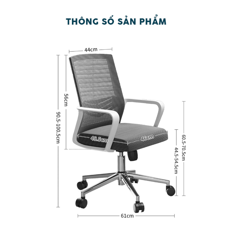 Lưng lưới mesh thoáng khí, đệm mút bọc vải, tay vịn nhựa cao cấp, khung & chân thép mạ chrome |