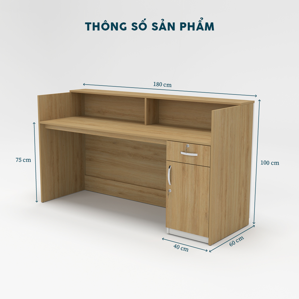 - Ngăn chứa thông minh: Sản phẩm được tích hợp các ngăn kéo và kệ lưu trữ, giúp sắp xếp tài liệu, văn phòng phẩm gọn gàng, tiện lợi cho nhân viên lễ tân.