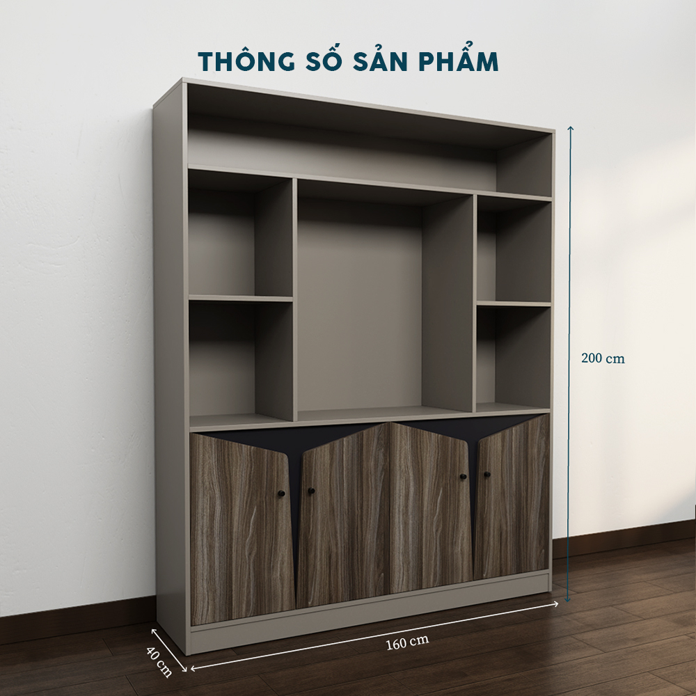 Thiết Kế Đỉnh Cao, Đánh Thức Mọi Ánh Nhìn TGDY011 chinh phục ngay từ cái nhìn đầu với bố cục đa ngăn bất đối xứng tinh tế: kệ mở trung tâm hình thang rộng rãi kết hợp bốn cánh cửa vân gỗ uốn lượn mềm mại, tạo chiều sâu thị giác và cảm giác sang trọng bất tận. Tông màu xám nhạt hiện đại hòa quyện vân gỗ óc chó nổi bật, dễ dàng nâng tầm mọi phong cách văn phòng từ tối giản công nghệ đến cổ điển quyền lực.