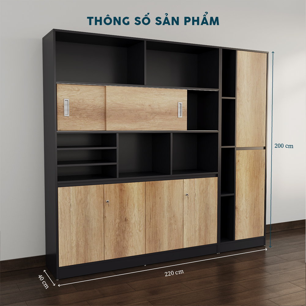 Thiết Kế Đột Phá, Mở Rộng Tầm Nhìn TGDY013 chinh phục bằng chiều rộng vượt trội, bố cục bất đối xứng thông minh: cửa lùa đôi tầng trên, ba cánh mở dưới, khoang phụ cao tầng bên phải và kệ mở đa cấp bên trái. Tông đen than chì mạnh mẽ hòa quyện vân gỗ sồi vàng óng ánh, tạo hiệu ứng thị giác 3D, lý tưởng cho văn phòng lớn hoặc phòng họp cấp cao.