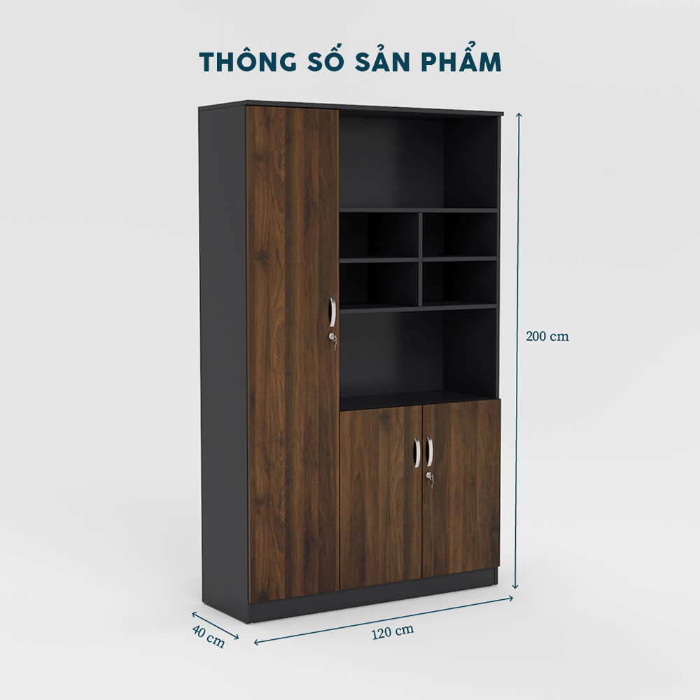 Tủ sở hữu kiểu dáng hiện đại, chi tiết tinh tế, phù hợp với văn phòng lãnh đạo. Kích thước cân đối (D40 x R120 x C200 cm) tối ưu diện tích, tông nâu đậm và khung đen bóng tạo vẻ quyền uy.