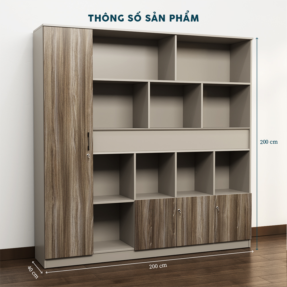 Với chiều dài 200cm và chiều cao 200cm, TGDY035 sở hữu hệ thống ngăn mở – ngăn kín – tủ cánh gỗ được phân chia hợp lý. Người dùng có thể lưu trữ hồ sơ, tài liệu, phụ kiện văn phòng hoặc trưng bày vật phẩm trang trí để làm đẹp không gian. Thiết kế tủ cao giúp tận dụng tối đa chiều cao phòng, tối ưu hóa diện tích sử dụng.