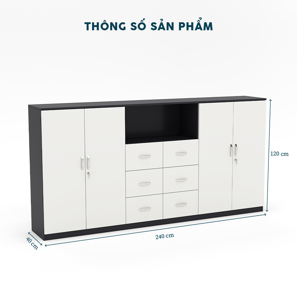 Với chiều dài 240cm và độ sâu 40cm, tủ cung cấp không gian lưu trữ rộng rãi với các ngăn khóa, ngăn kéo và kệ mở, phù hợp để sắp xếp tài liệu và vật dụng văn phòng một cách hiệu quả.