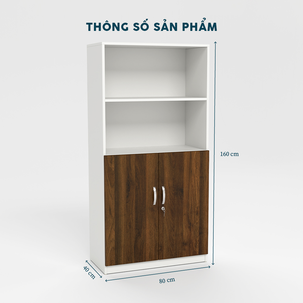 Sản phẩm nổi bật với thiết kế hai tông màu, phần trên trắng sáng kết hợp phần dưới gỗ nâu đậm sang trọng. Chiều cao 160cm cùng kệ mở và ngăn tủ khóa mang lại sự gọn gàng và thẩm mỹ cao.