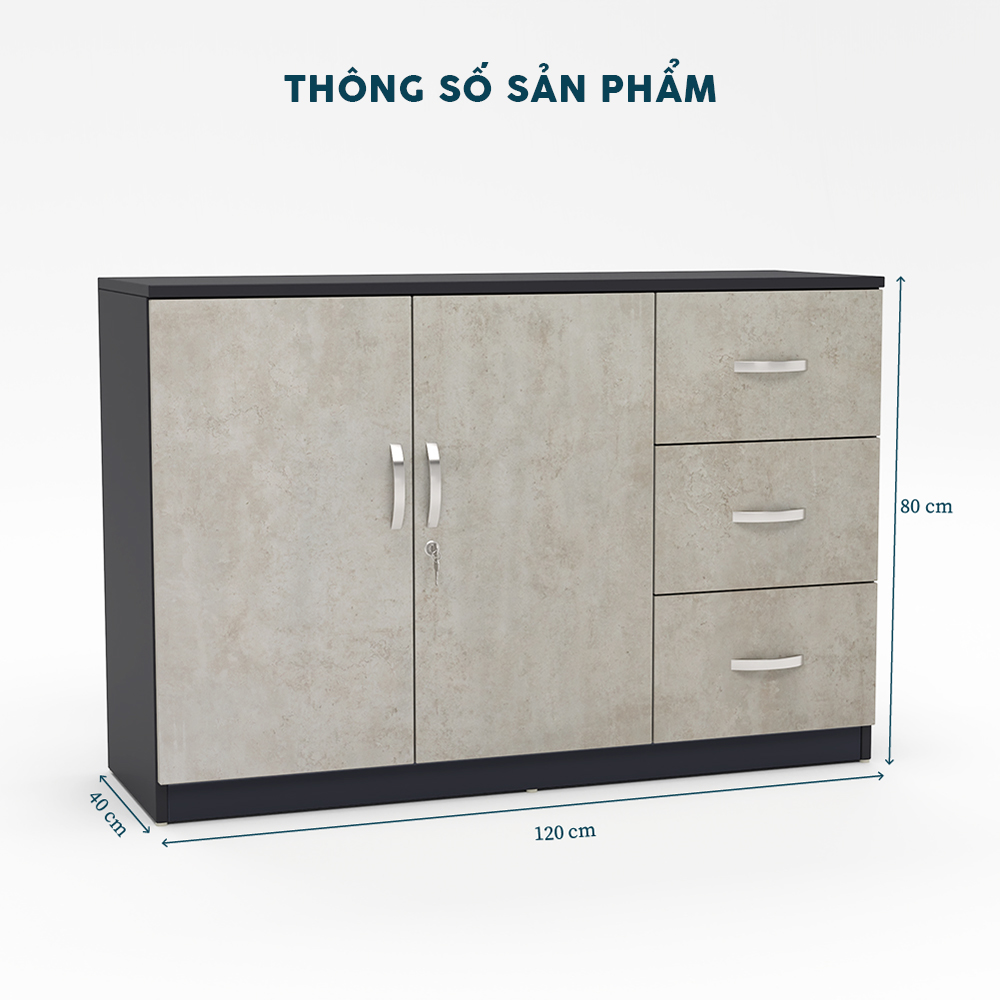 Với chiều dài 120cm và độ sâu 40cm, tủ cung cấp không gian lưu trữ rộng rãi với ngăn tủ khóa an toàn và ba ngăn kéo, lý tưởng để sắp xếp tài liệu và vật dụng văn phòng một cách hiệu quả.