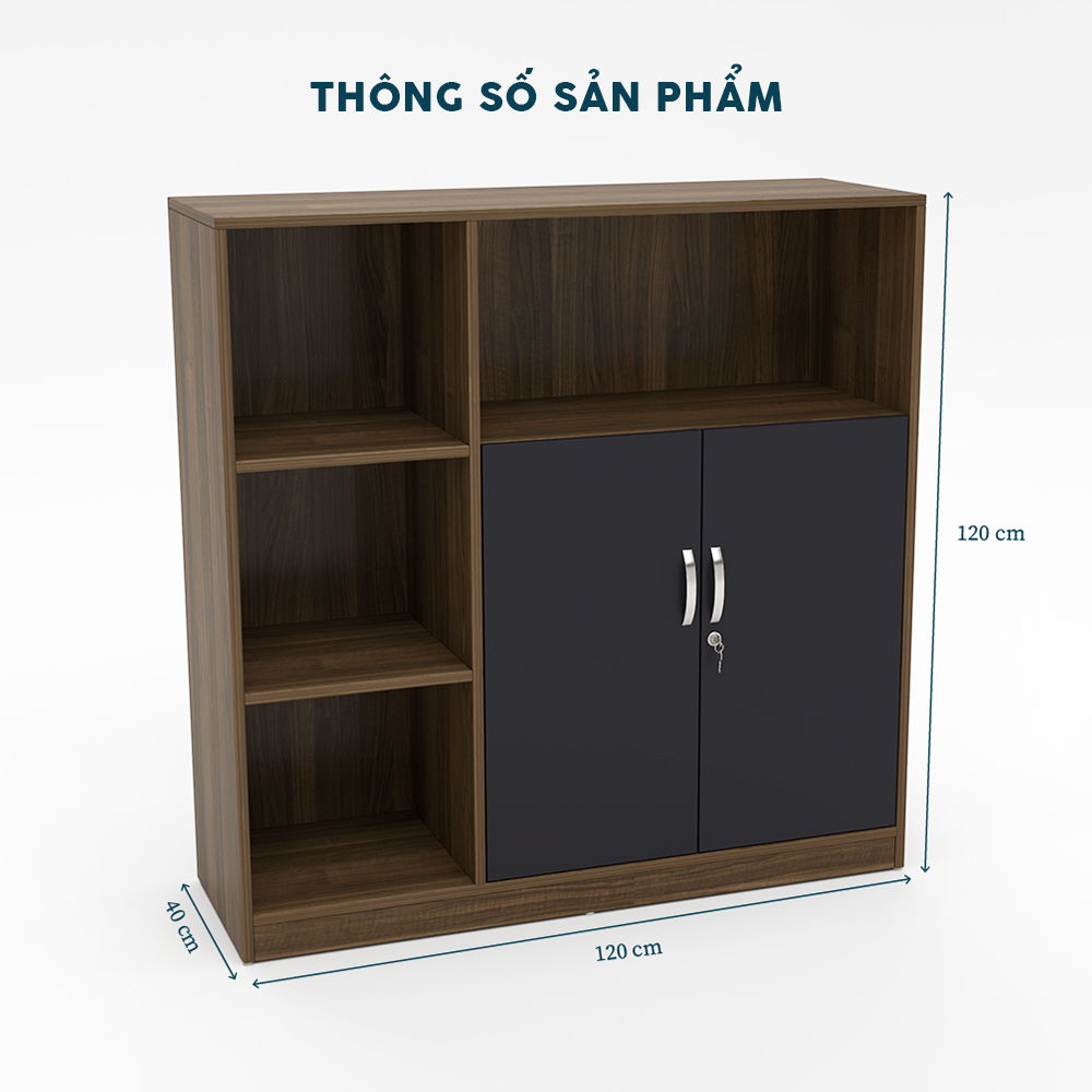 Sản phẩm nổi bật với thiết kế hai tông màu, phần trên và bên gỗ nâu tự nhiên kết hợp phần tủ đen sang trọng. Chiều cao 120cm cùng kệ mở và ngăn tủ khóa mang lại sự gọn gàng và thẩm mỹ cao.