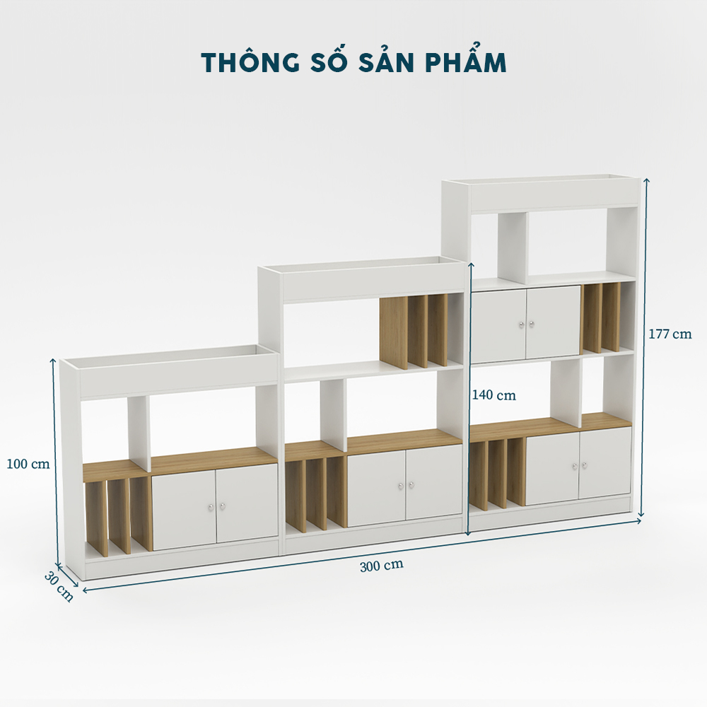 Với chiều sâu 30cm và chiều dài 300cm, tủ cung cấp dung tích lưu trữ rộng rãi với ba ngăn tủ khóa an toàn và kệ mở, lý tưởng để sắp xếp tài liệu và vật dụng văn phòng.