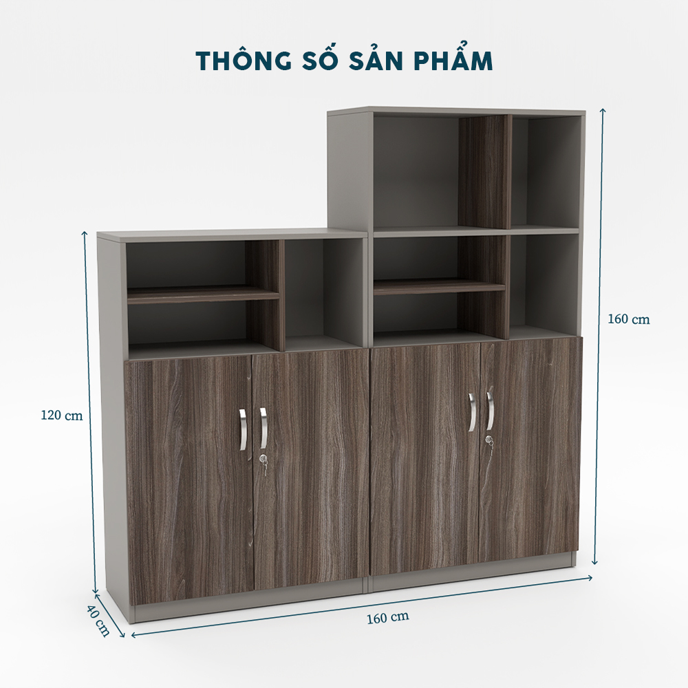 Với chiều sâu 40cm và chiều dài 160cm, tủ mang đến diện tích lưu trữ rộng rãi với bốn cửa tủ khóa bảo mật và kệ mở phía trên, thích hợp để tổ chức hồ sơ và đồ dùng văn phòng.