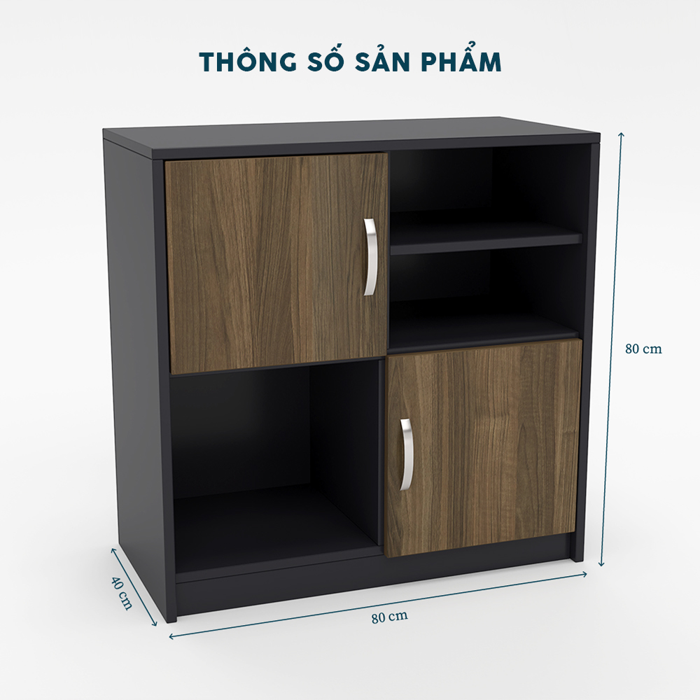 Với chiều sâu 40cm và chiều dài 80cm, tủ cung cấp không gian lưu trữ tiện ích với hai cửa tủ khóa an toàn và kệ mở phía trên, lý tưởng để sắp xếp tài liệu và vật dụng văn phòng.